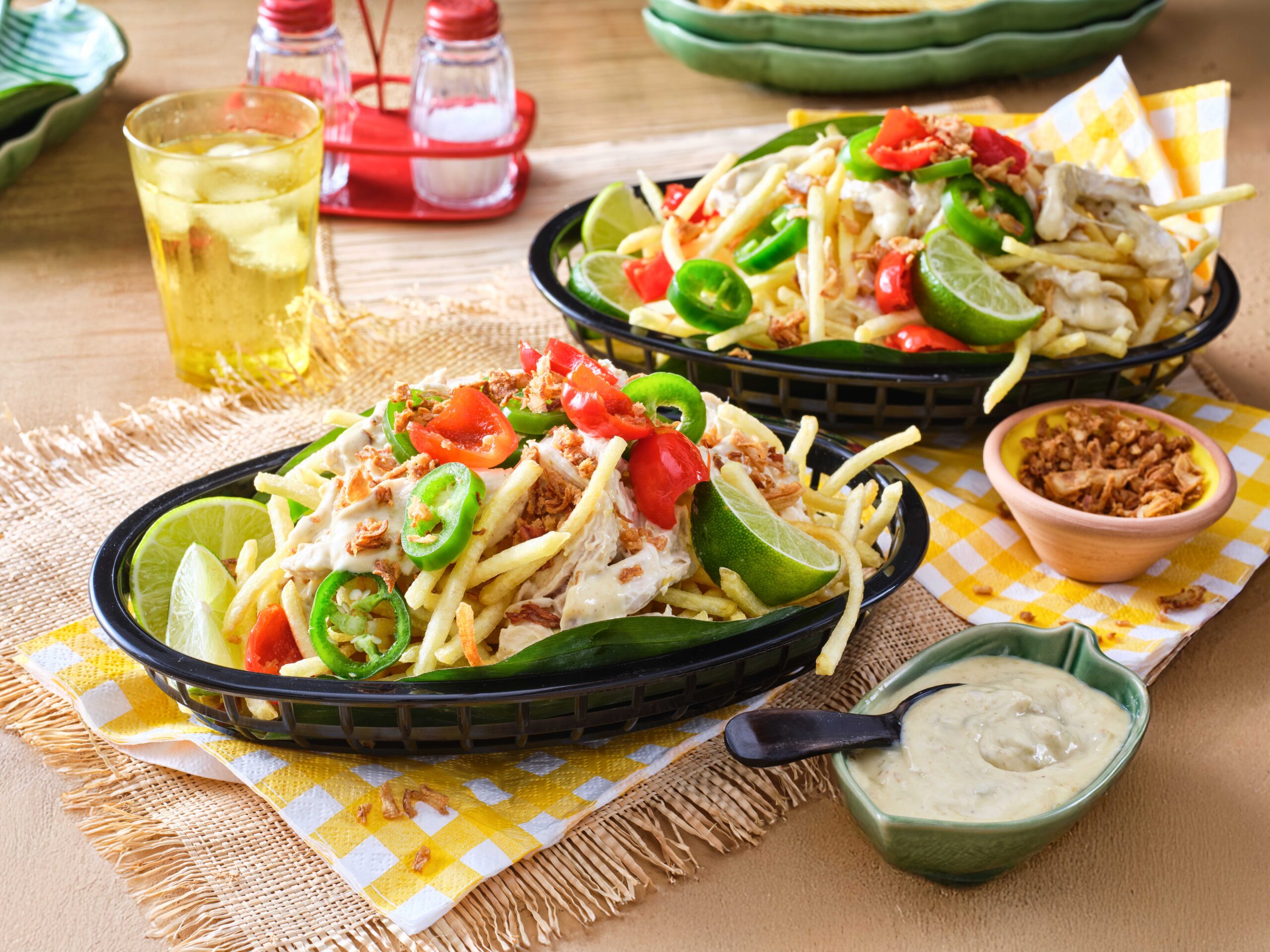 - Stapel de frietjes op een bord of schaal en verdeel daarover de pulled chicken, peppadews, jalapeño en gebakken uitjes.